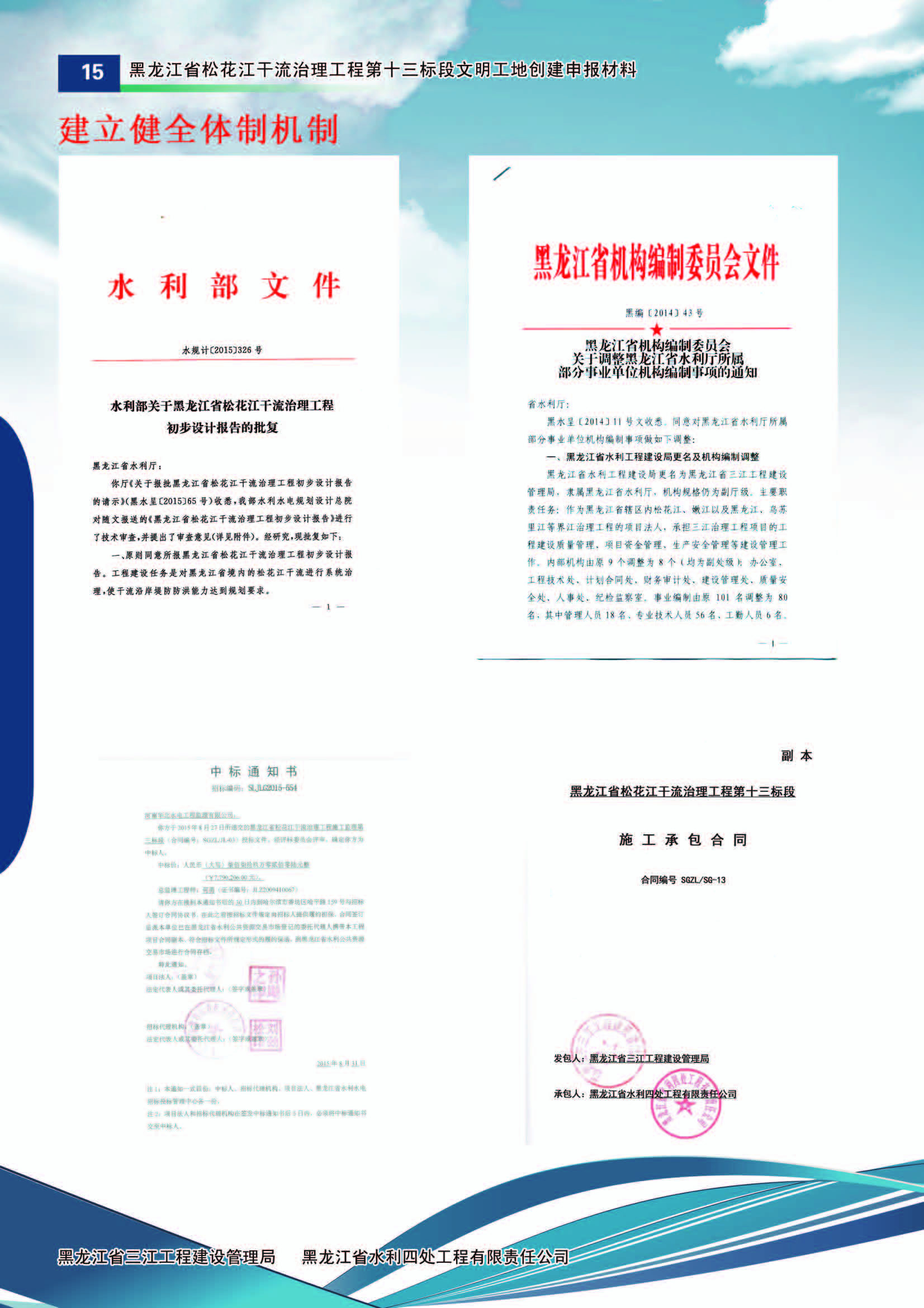 2015年8月22日,經(jīng)過(guò)公開(kāi)評(píng)標(biāo),松花江干流治理工程第十三標(biāo)段確定施工中標(biāo)單位為黑龍江省水利四處工程有限責(zé)任公司,合同金額為1.23億元,合同工期489日歷天。
