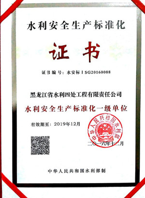 水利部安全生產(chǎn)標(biāo)準(zhǔn)化一級(jí)單位證書